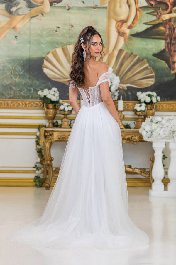 Radiate timeless beauty and grace in the Dancing Queen Wedding Gown 0288. This stunning bridal gown showcases a romantic off-the-shoulder neckline with delicate floral lace appliqués that cascade along the structured bodice. The corset-style top offers a flattering fit while enhancing the natural waistline. Flowing into a voluminous A-line skirt, the gown is crafted from soft layers of tulle that add movement and elegance. Perfect for the classic bride who wants to feel like royalty on her special day.
