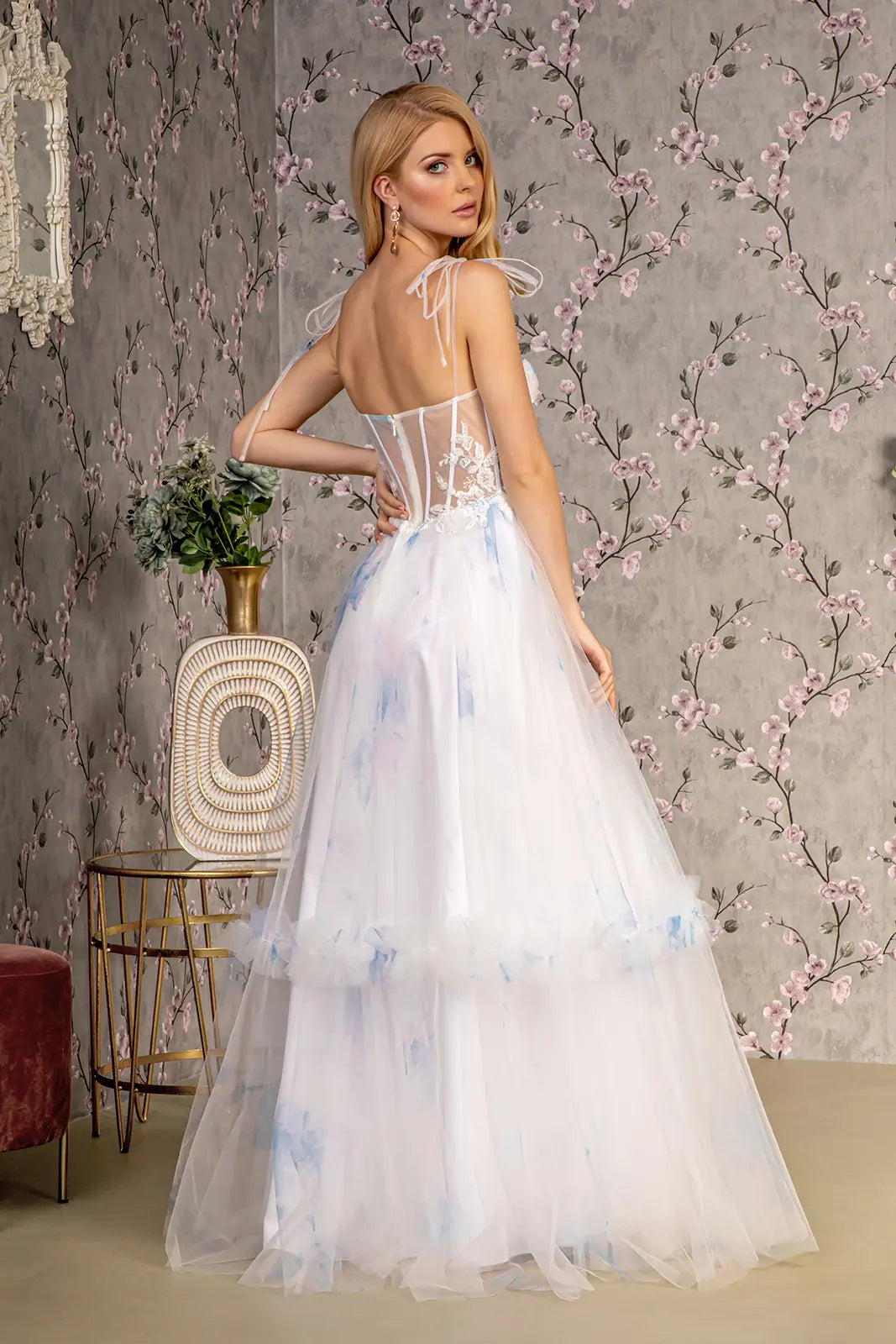 Graceful and romantic, GL3208 by GLS Collective is a stunning ivory A-line gown featuring delicate embroidery and beadwork on a sheer bodice. Soft tie-up shoulder straps add a charming, feminine touch, while the flowy mesh skirt brings effortless movement—perfect for weddings, graduations, or any special occasion.