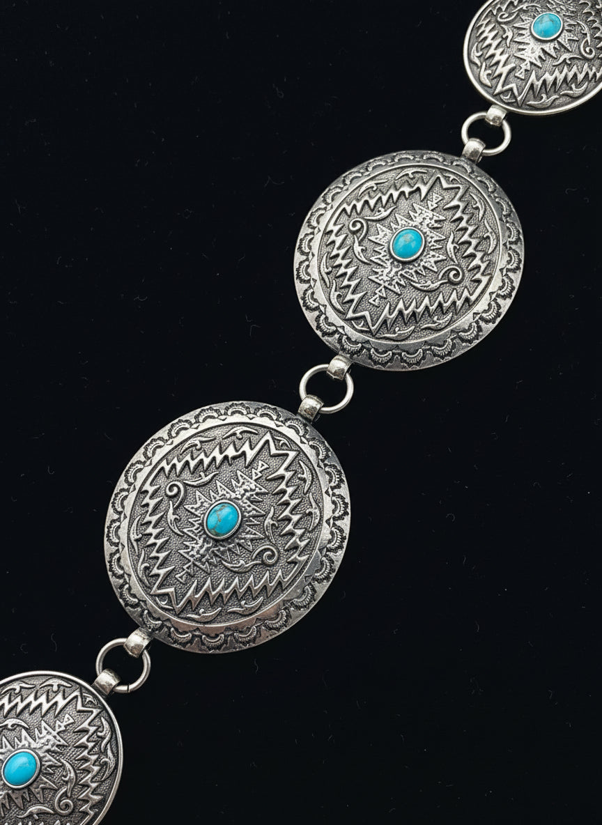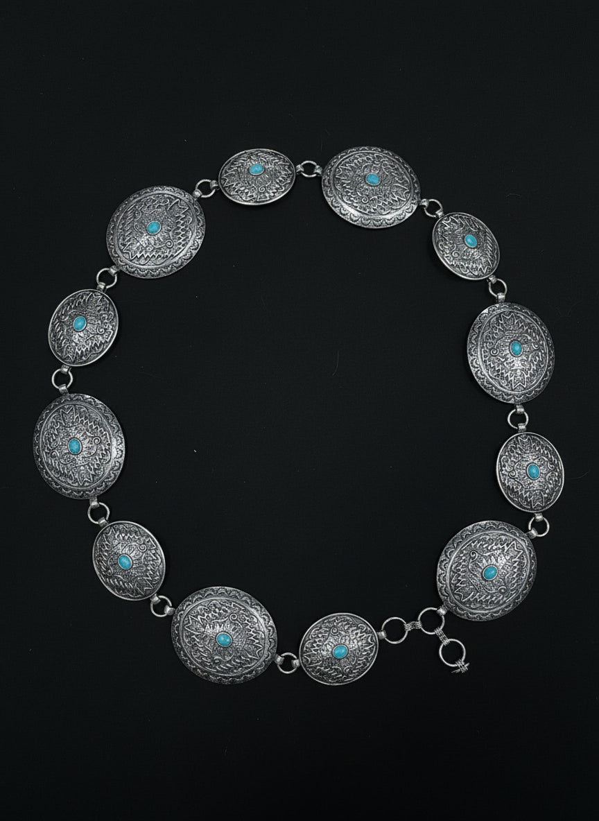 Add a touch of Southwestern elegance to your look with this striking silver belt, designed with a bold turquoise stone centerpiece that instantly stands out. The intricate metalwork brings texture and shine, while the vibrant turquoise adds that signature pop of color. Perfect for elevating denim, dresses, or western formalwear, this statement accessory blends classic western charm with modern style—only at Moreno’s Wear. One size fits most
