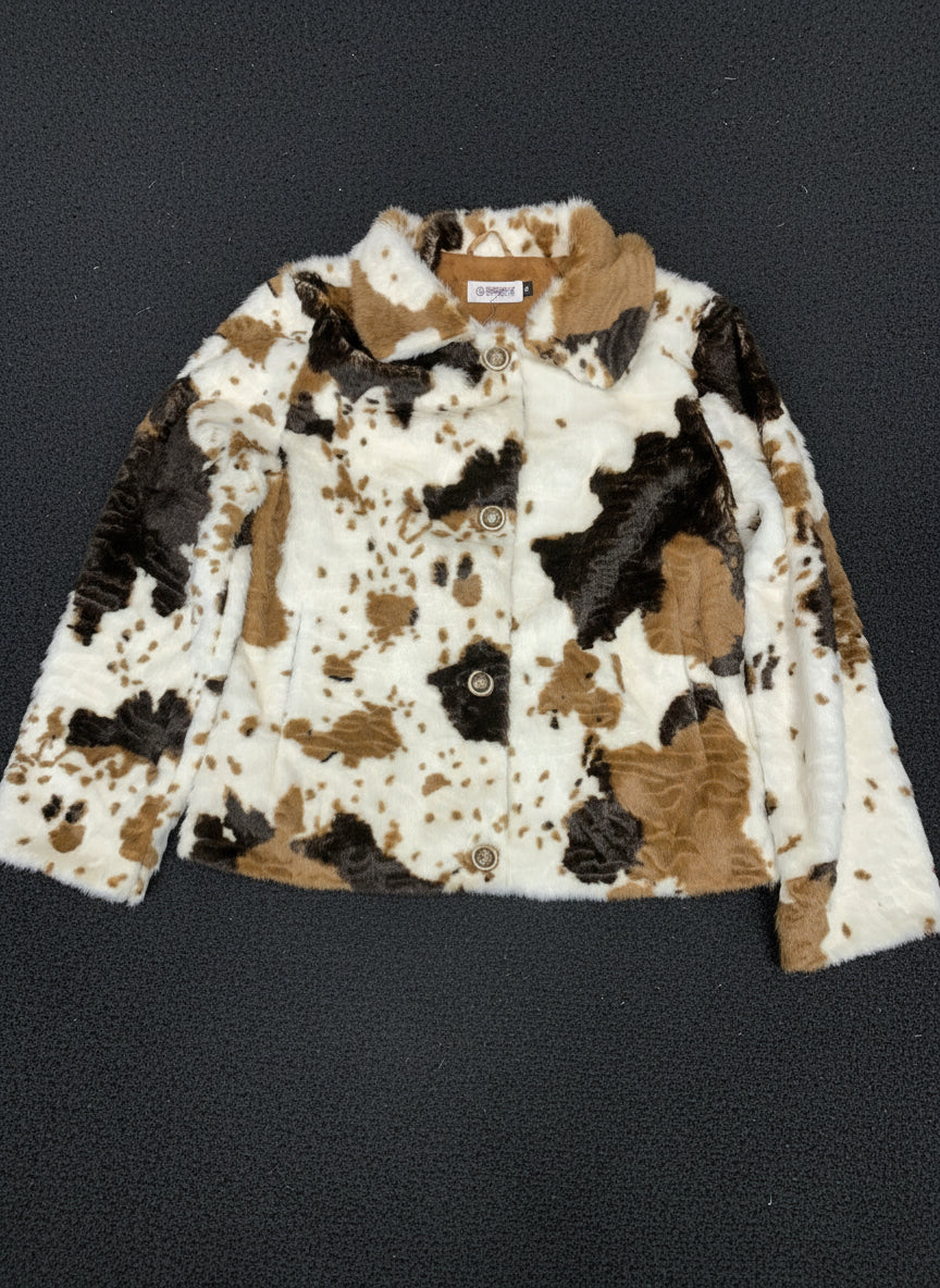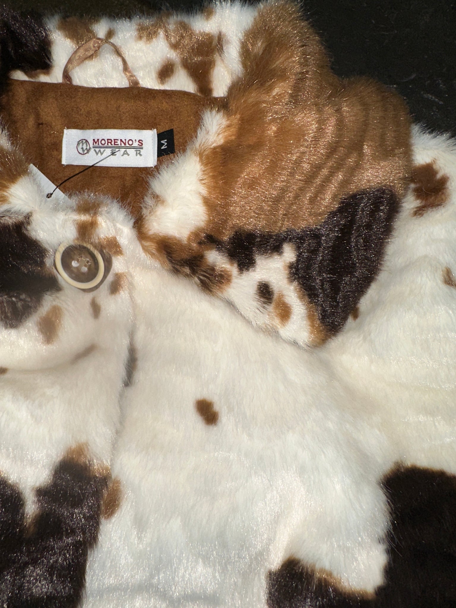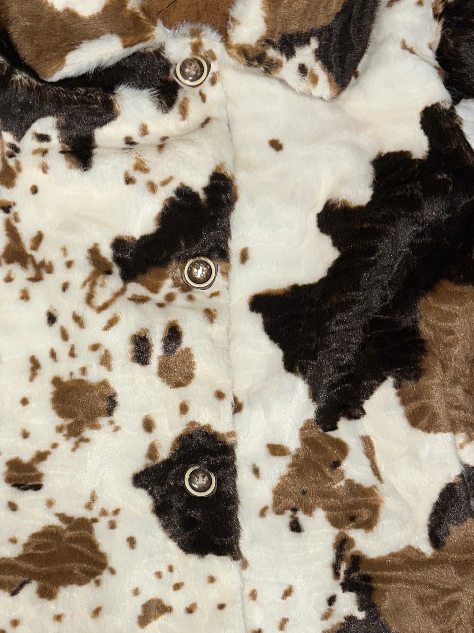 Blend comfort and western flair with this cow print shirt-style jacket, designed to wear like a lightweight coat without the long length. Featuring a bold cowhide pattern and classic brown buttons, it brings the perfect mix of rustic charm and modern style. The soft, structured fabric makes it ideal for layering over your favorite tops, while the relaxed fit keeps it easy and versatile. A standout piece for rodeos, casual days, and western nights—exclusively at Moreno’s Wear.