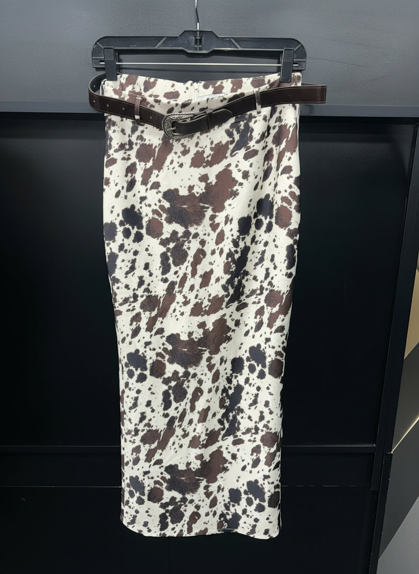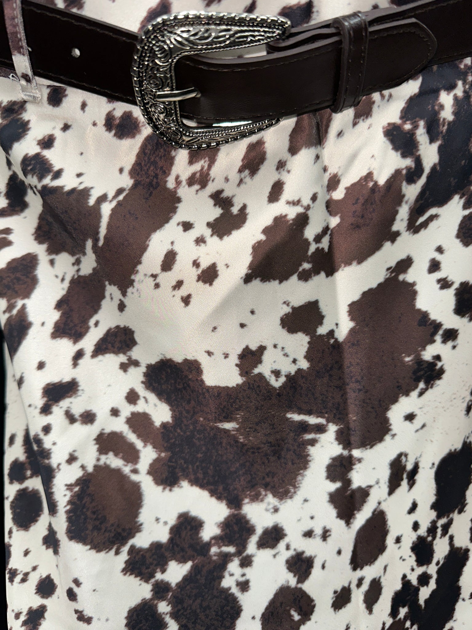 Turn heads with this playful cow print skirt, designed in a bold brown-and-white pattern and finished with a contrasting brown belt that adds a warm western touch. The high-waisted fit flatters your shape, while the soft, easy-to-wear fabric makes it perfect for pairing with boots, bodysuits, or denim tops. Fun, trendy, and full of rodeo-ready attitude—this skirt is a standout piece for any western wardrobe, only at Moreno’s Wear.