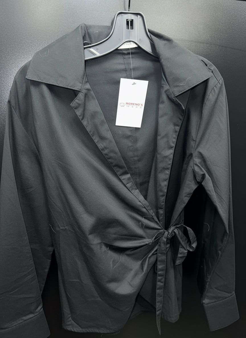 Chic, sleek, and effortlessly stylish, this black wrap blouse is the perfect blend of modern elegance and everyday versatility. Designed with a flattering wrap-front silhouette, it features an adjustable side tie that creates a custom fit and adds a touch of soft draping at the waist. The pointed collar and long sleeves elevate the look, making it easy to dress up with denim, skirts, or trousers. A timeless wardrobe staple for any season—available now at Moreno’s Wear.