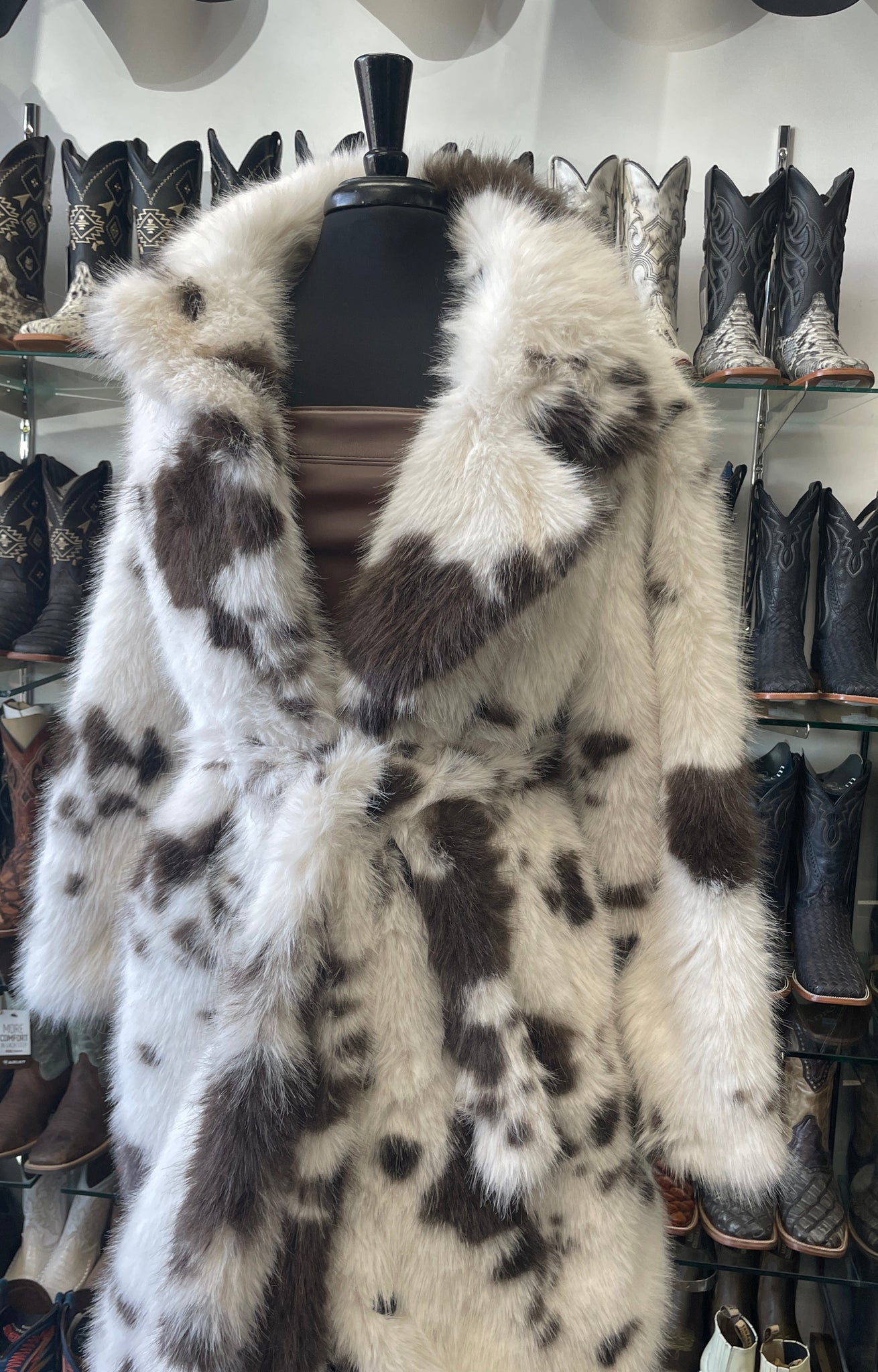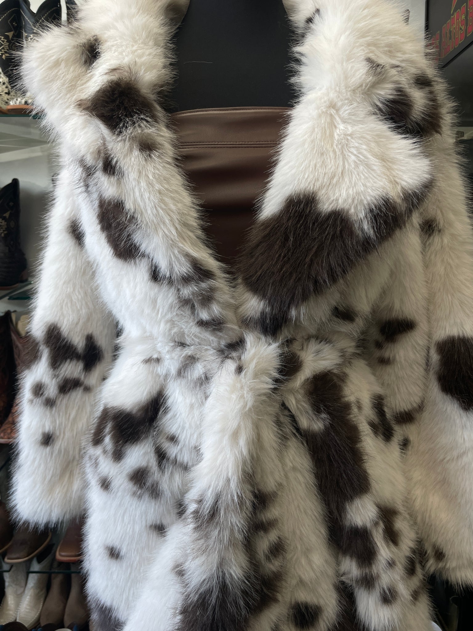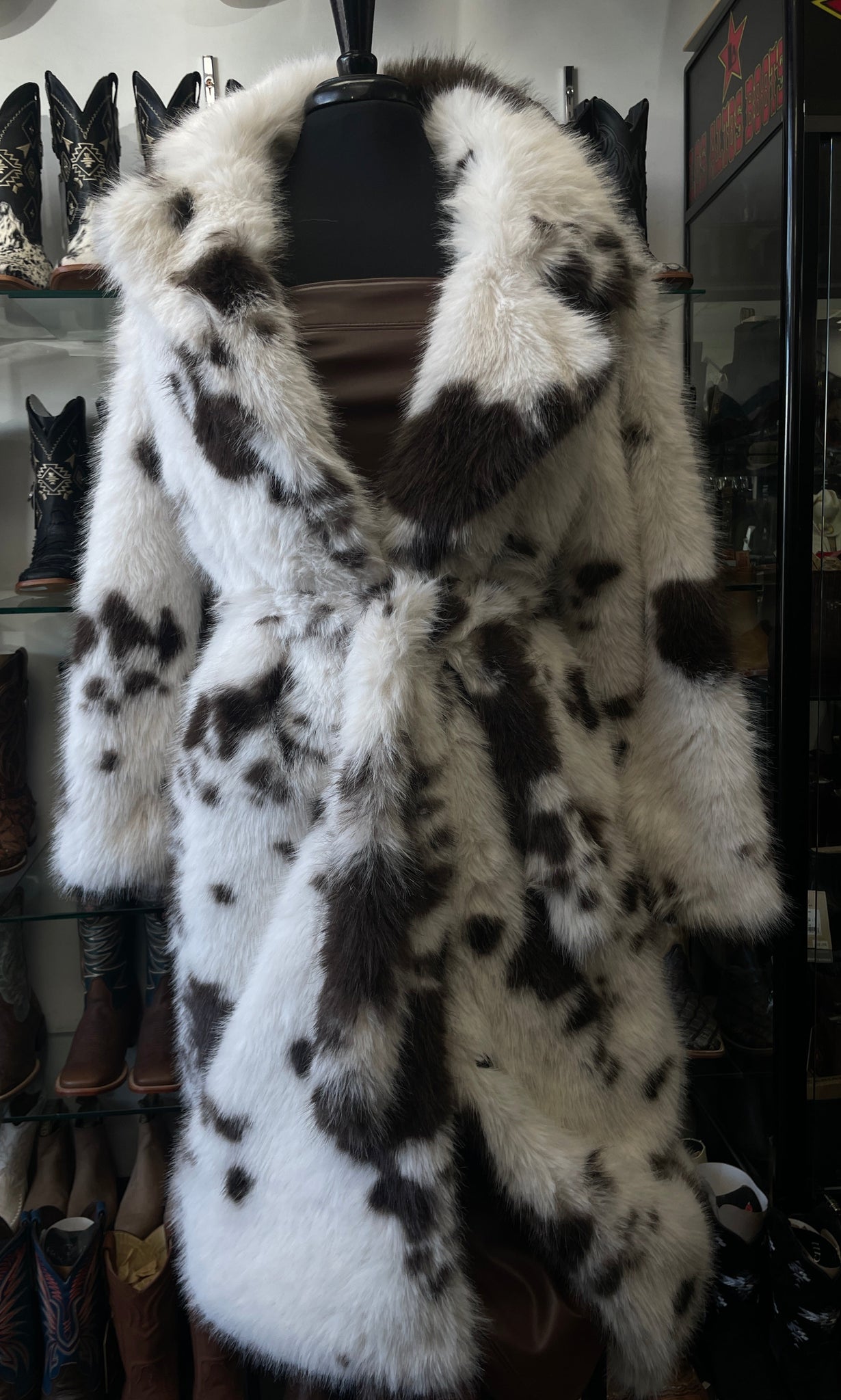 Turn heads in this bold cow-print fur coat, made for standout western style with a luxe edge. Crafted from ultra-soft, plush fur, this coat features a striking brown-and-ivory cowhide-inspired pattern, giving each piece a unique look.