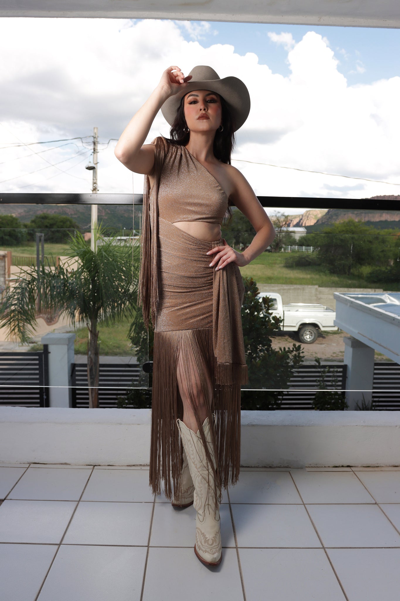 Turn heads in this black asymmetrical fringe dress from Moreno’s Wear. Featuring a one-shoulder neckline, side cutout, and high-slit fringe hem, it combines modern edge with Western flair. Made from fitted stretch fabric that flatters your shape — perfect with your favorite cowgirl boots for a bold, confident look.