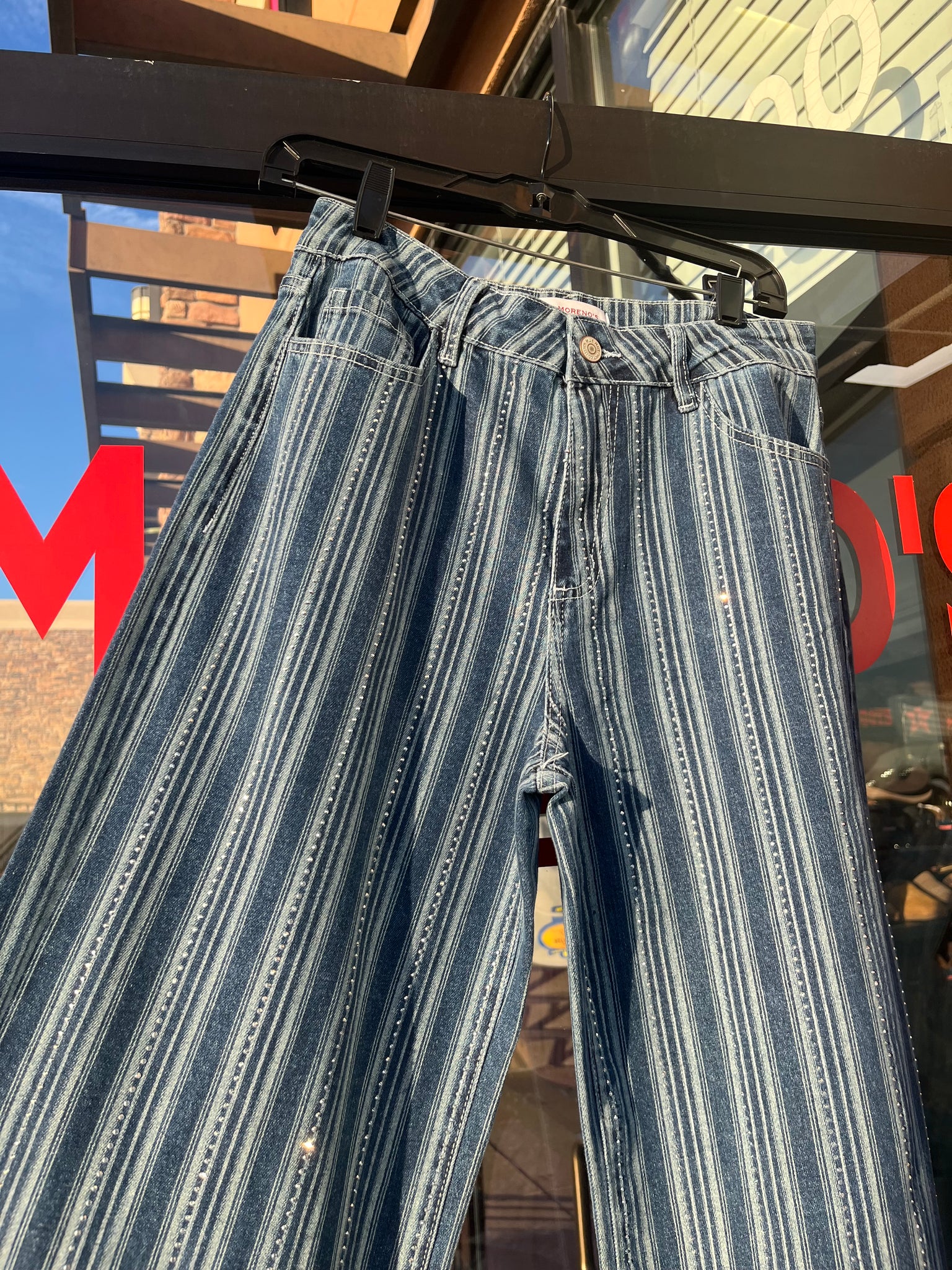 Denim set by Moreno’s Wear featuring a striped jean and matching vest designed to turn heads. The fitted denim vest showcases vertical stripe detailing with bedazzled accents that catch the light for a touch of glamour. The high-rise jeans mirror the same striped, embellished design, creating a coordinated look that blends Western flair with modern sparkle. Perfect for concerts, nights out, or statement streetwear — this outfit delivers bold style and confidence from top to bottom.