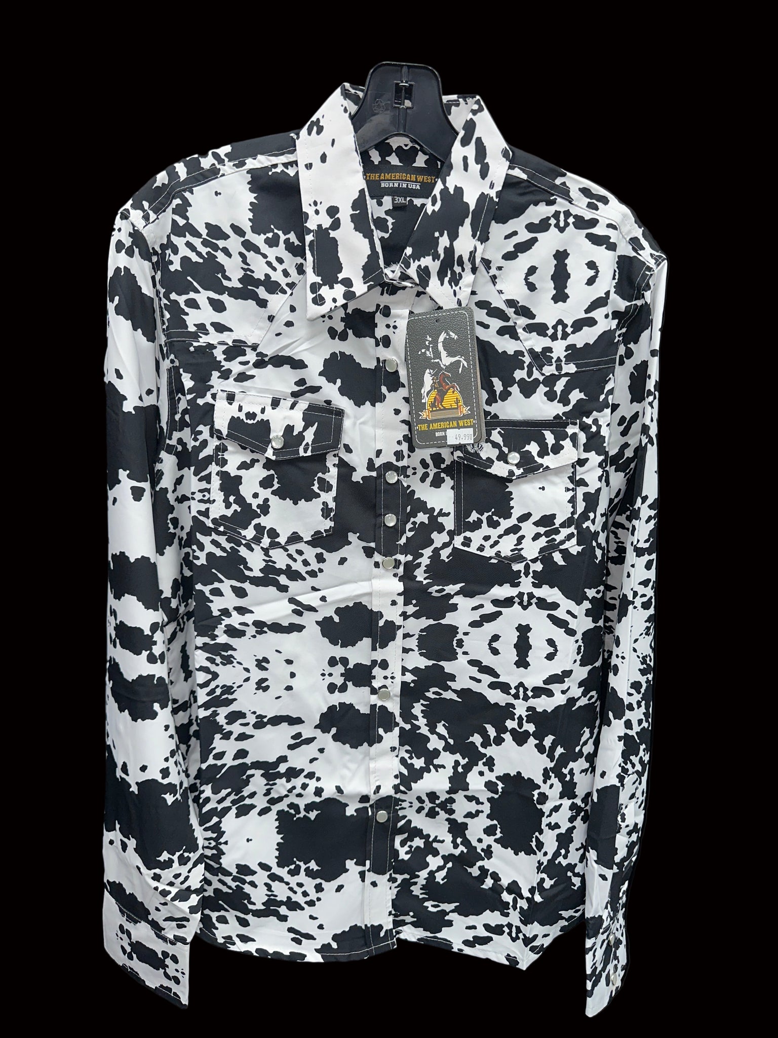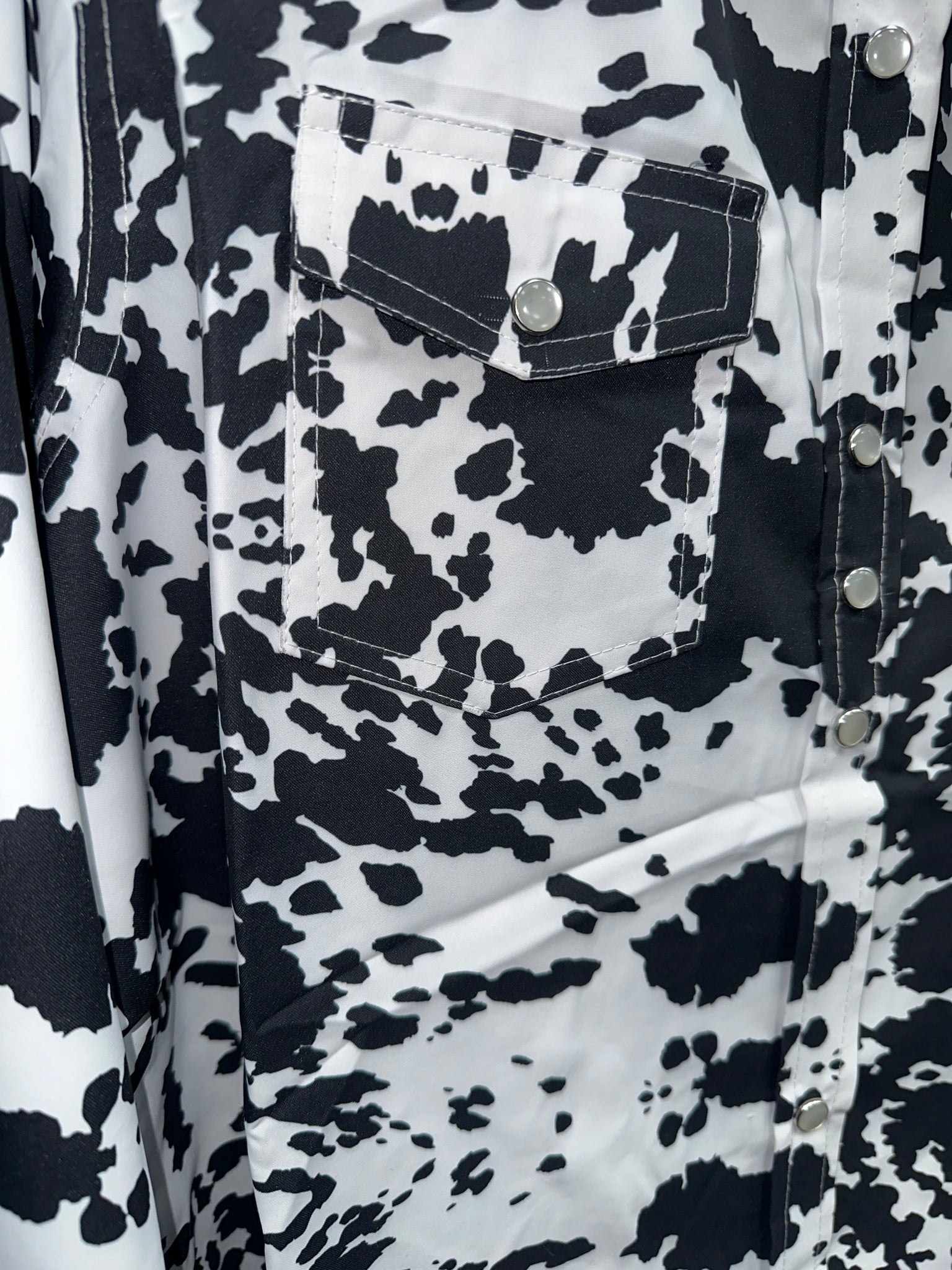 Stand out with this bold black and white cow-print western shirt, designed for those who like their style loud and unmistakably western. Crafted with smooth, lightweight fabric, it features classic snap-button closures, double flap chest pockets, and a traditional pointed yoke for that authentic cowboy look. Perfect for rodeos, concerts, layering or any statement outfit, this shirt delivers modern flair with true western attitude—only at Moreno’s Wear.