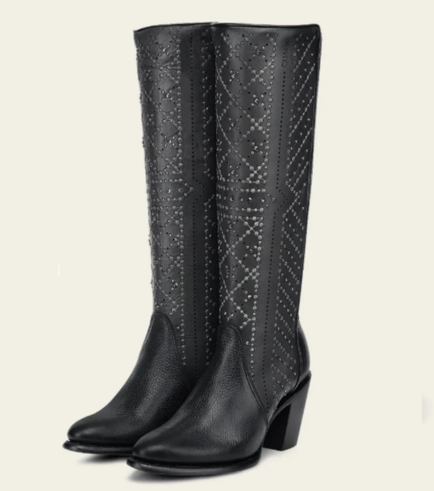 Bold and refined, the Cuadra CC257 tall boots showcase signature craftsmanship with a modern western feel. Made from premium black leather, they feature an intricate laser-cut and studded pattern along the shaft, adding texture and visual depth. The smooth leather foot, almond-shaped toe, and stacked heel provide a sleek, flattering silhouette while ensuring comfort and durability. Finished with subtle Cuadra branding, these boots are perfect for elevating everyday looks or pairing with dresses for a sophisticated western statement.