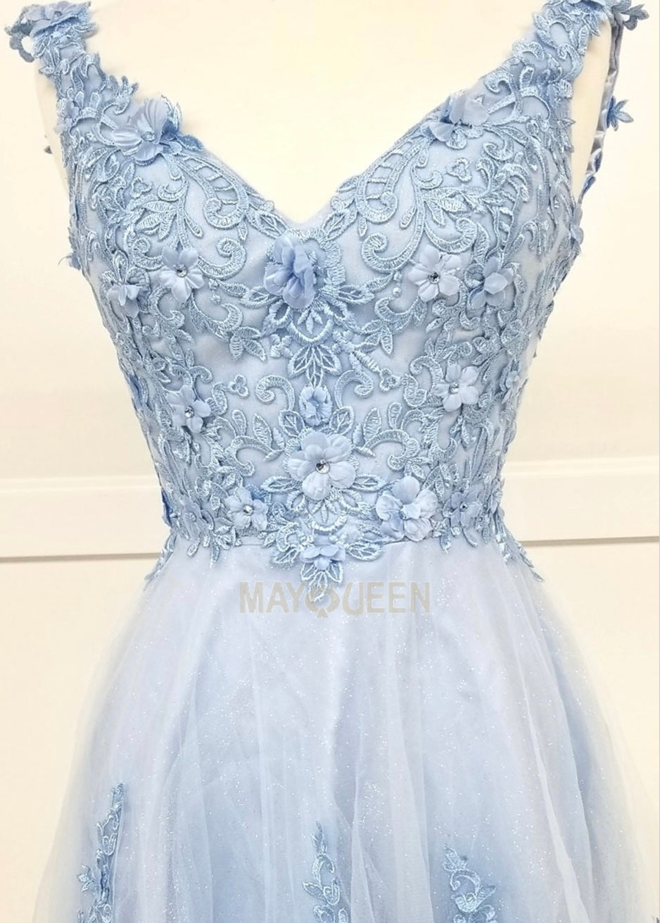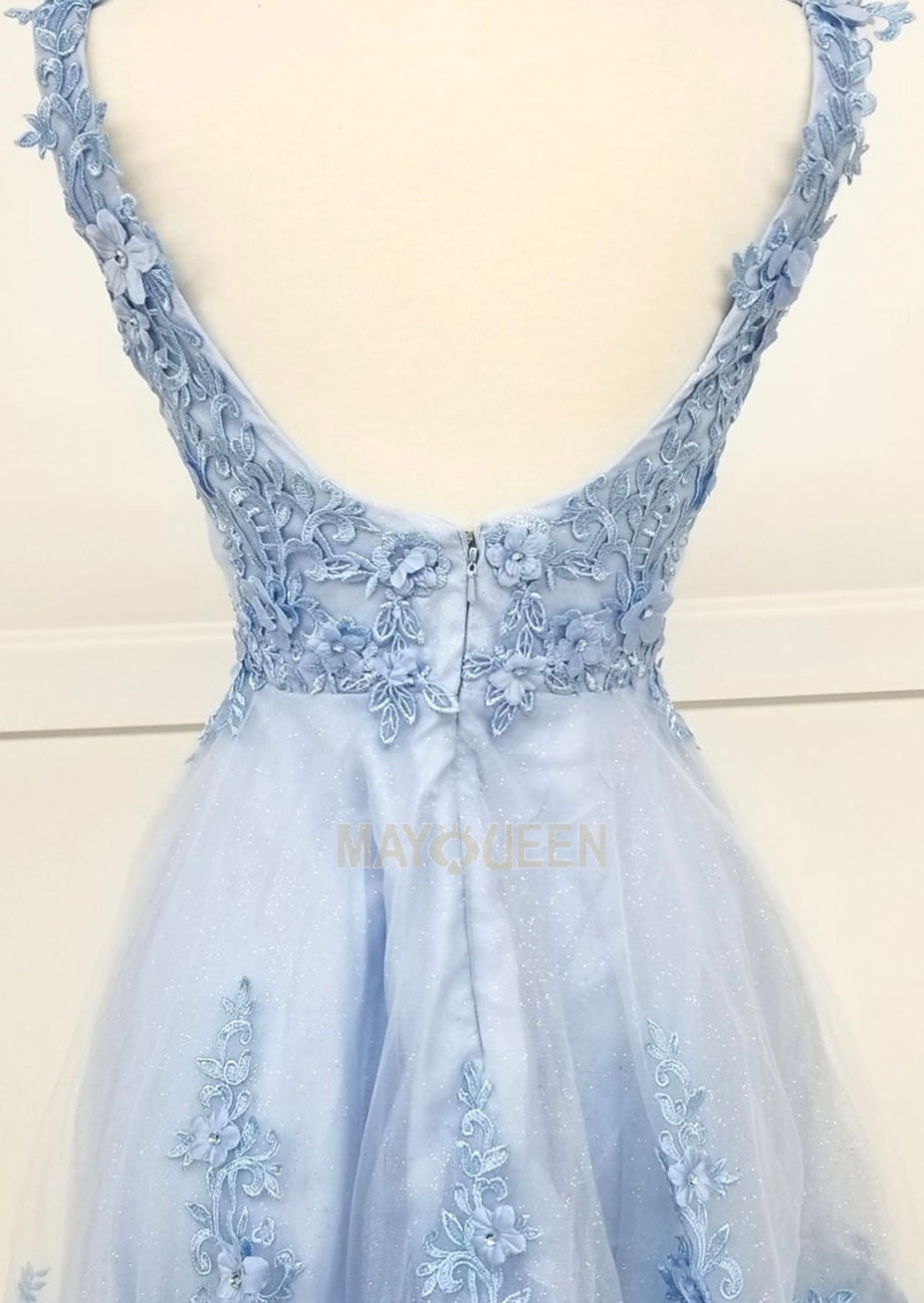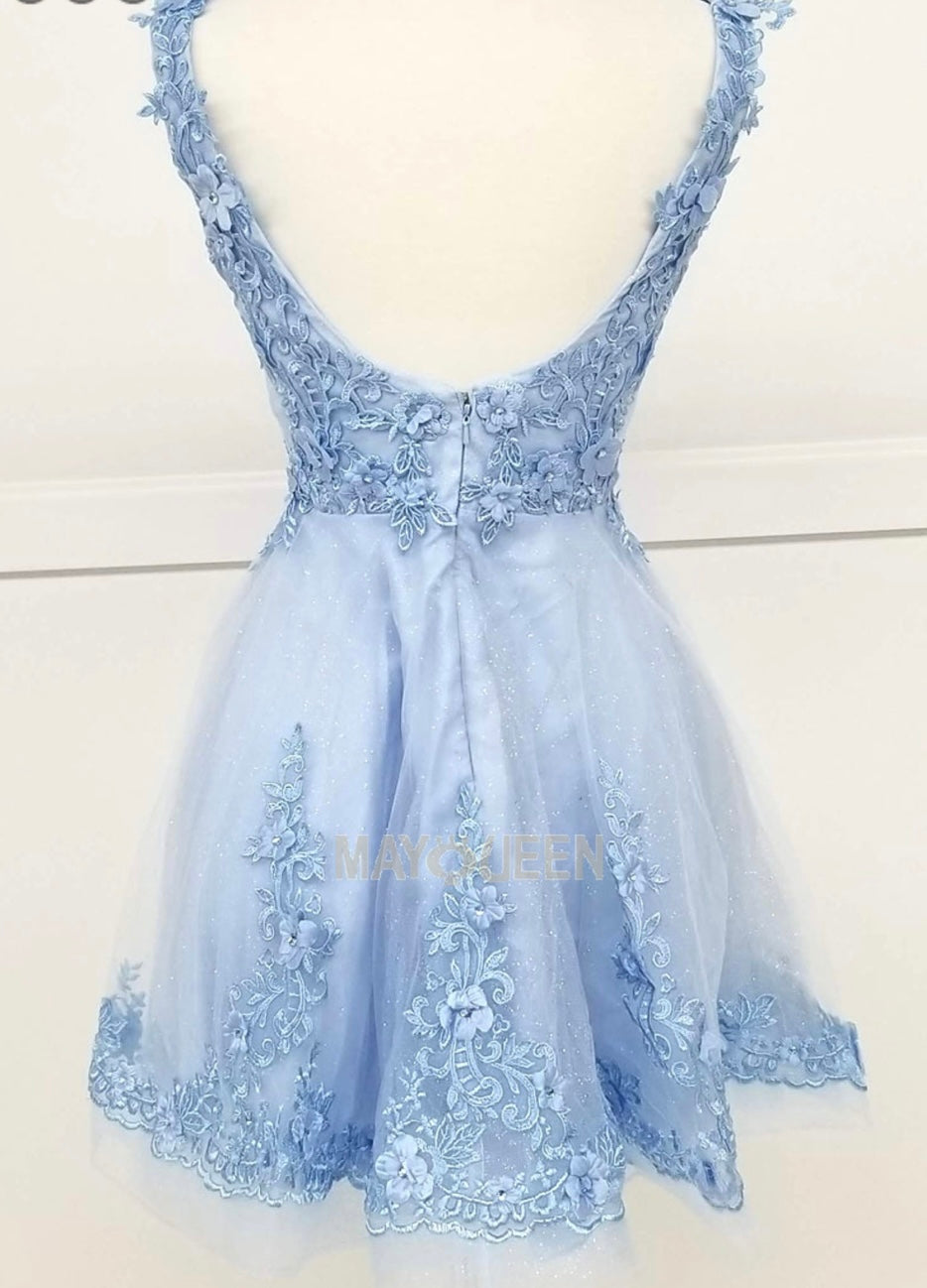 Turn heads in this charming short A-line dress by Chicas, style C311. Featuring a V-neckline and delicate floral appliqués, the fitted bodice is adorned with intricate lace and 3D flower embellishments for a romantic touch. The glitter tulle skirt adds soft volume and sparkle, while the floral appliqué hem completes the whimsical design. Perfect for semi-formal events, graduations, or sweet sixteens.