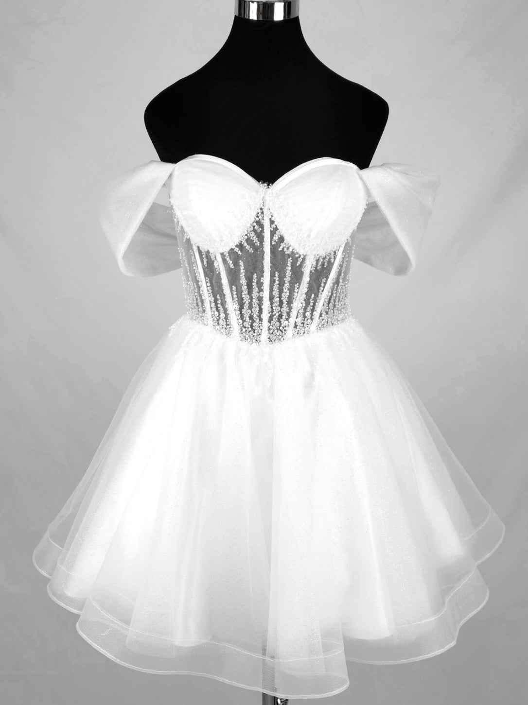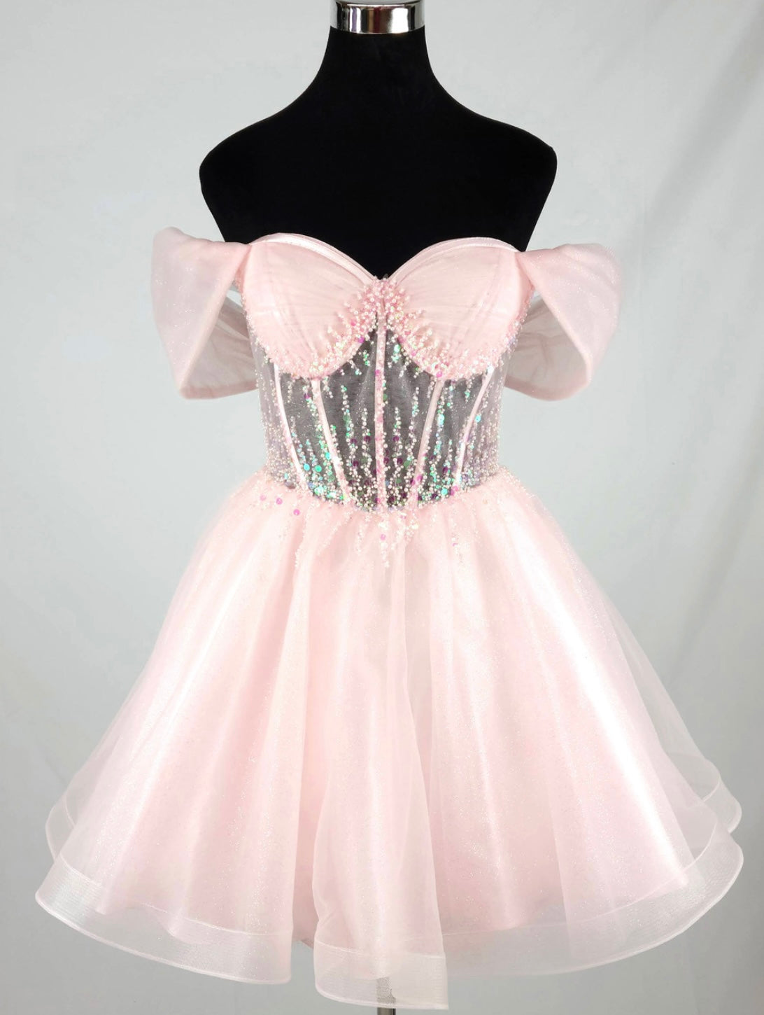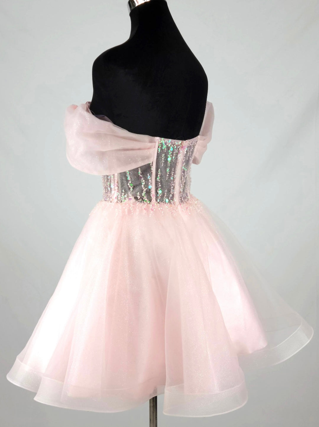 Turn heads in this enchanting short pink dress by Chicas, style C363. This off-the-shoulder design features a structured sweetheart neckline and a sheer corset-style bodice adorned with shimmering iridescent sequins and delicate beading. The voluminous organza puff sleeves add a whimsical touch, while the flared glittery tulle skirt creates a playful and princess-like silhouette. Perfect for sweet sixteens, cocktail parties, or special celebrations, this dress is the definition of youthful elegance and sparkle.