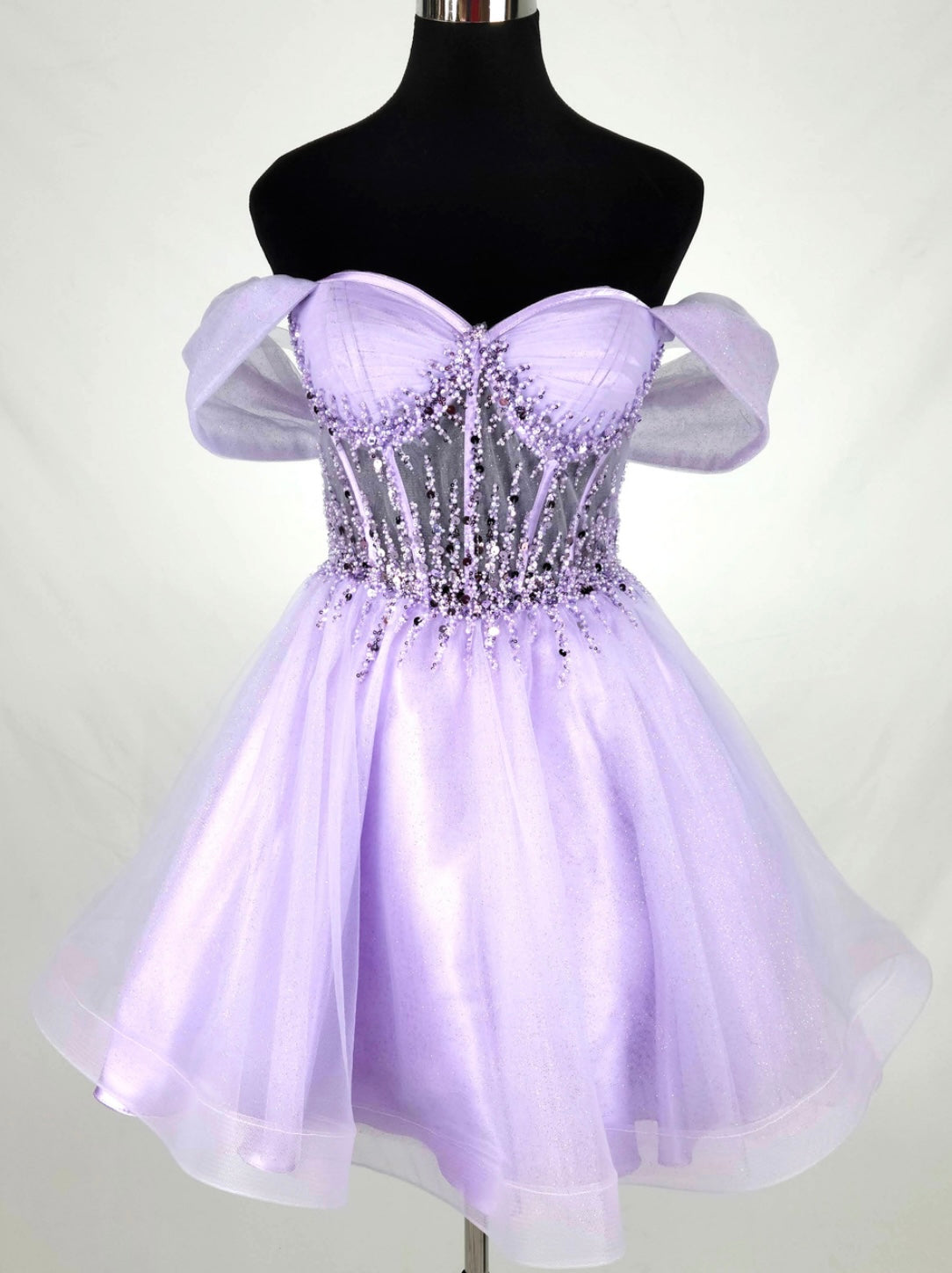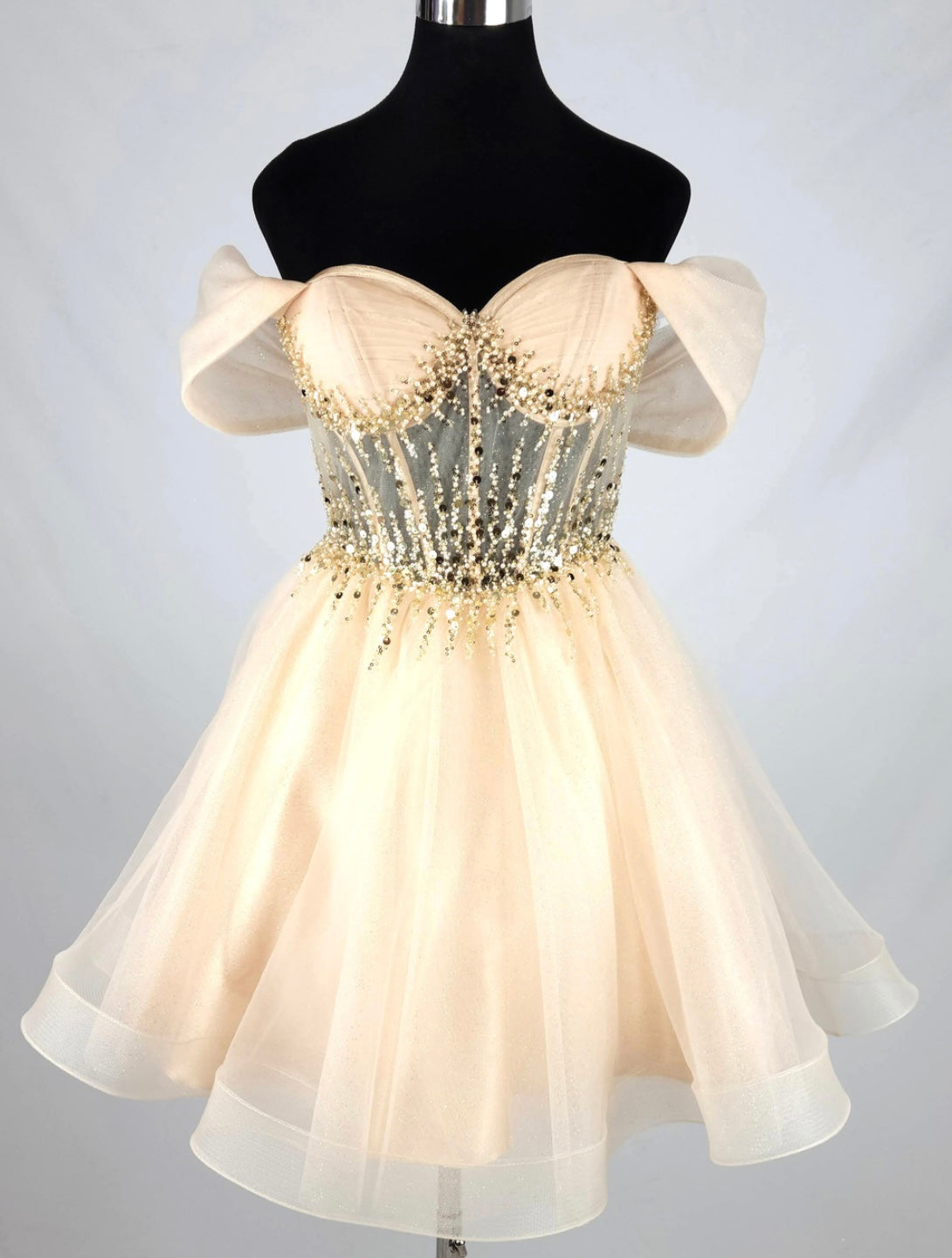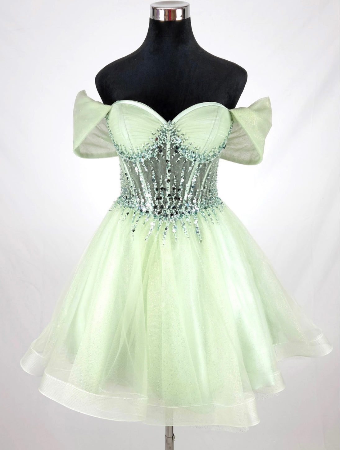 Turn heads in this enchanting short pink dress by Chicas, style C363. This off-the-shoulder design features a structured sweetheart neckline and a sheer corset-style bodice adorned with shimmering iridescent sequins and delicate beading. The voluminous organza puff sleeves add a whimsical touch, while the flared glittery tulle skirt creates a playful and princess-like silhouette. Perfect for sweet sixteens, cocktail parties, or special celebrations, this dress is the definition of youthful elegance and sparkle.