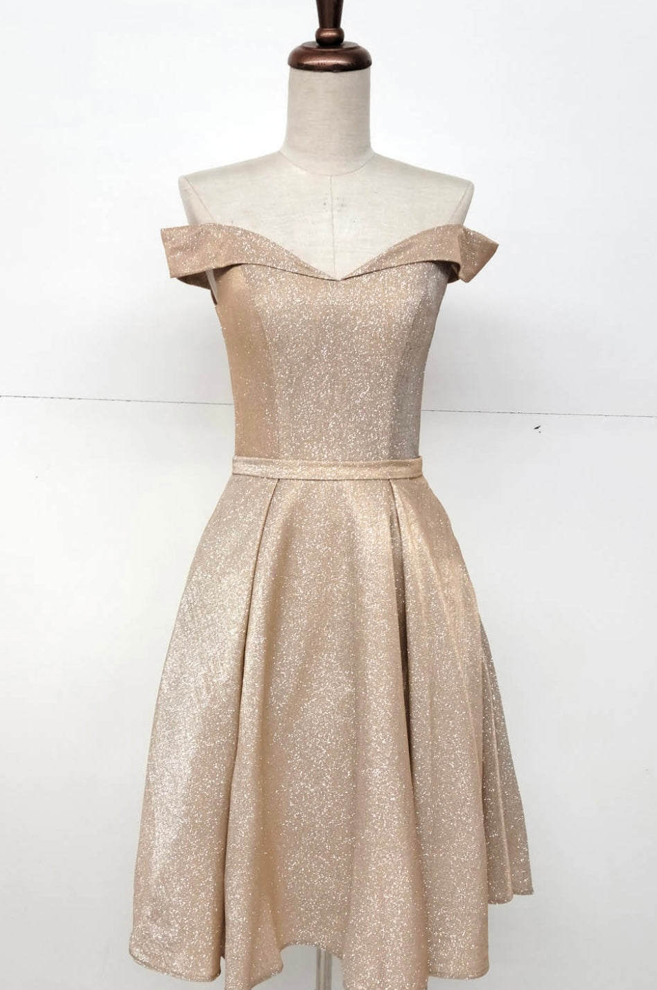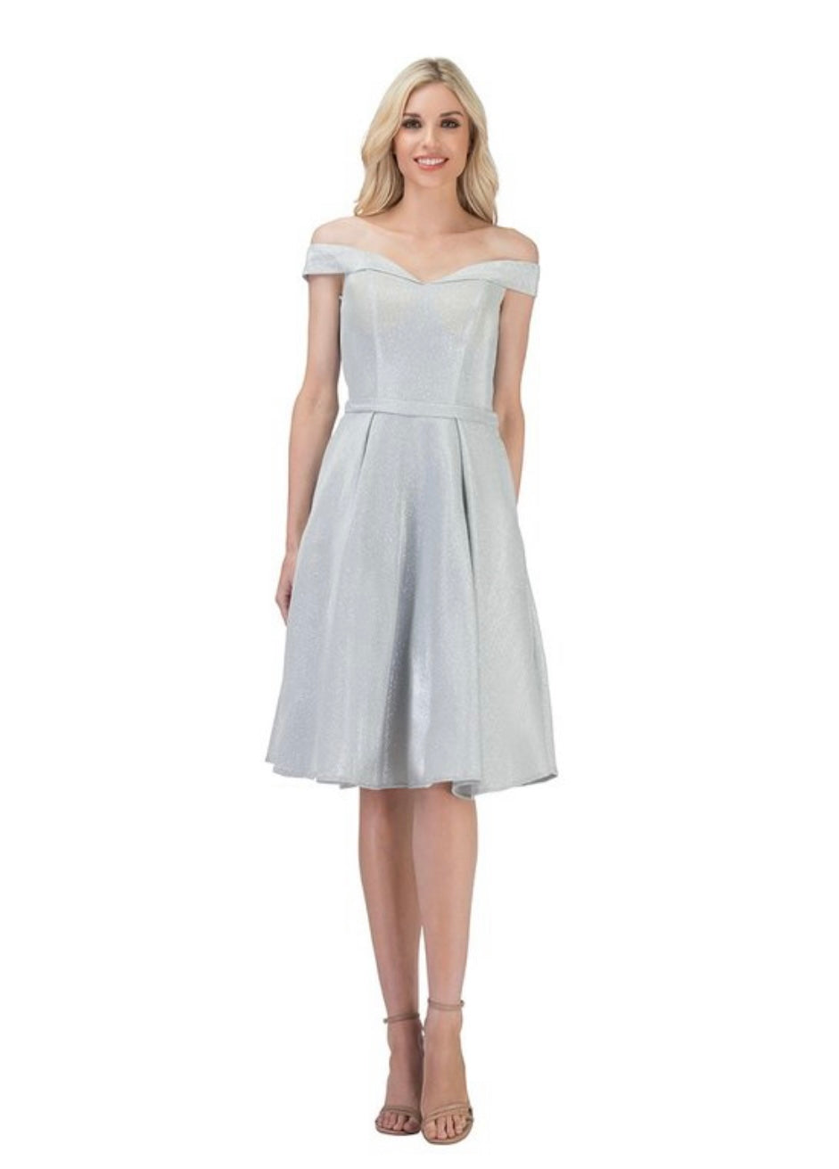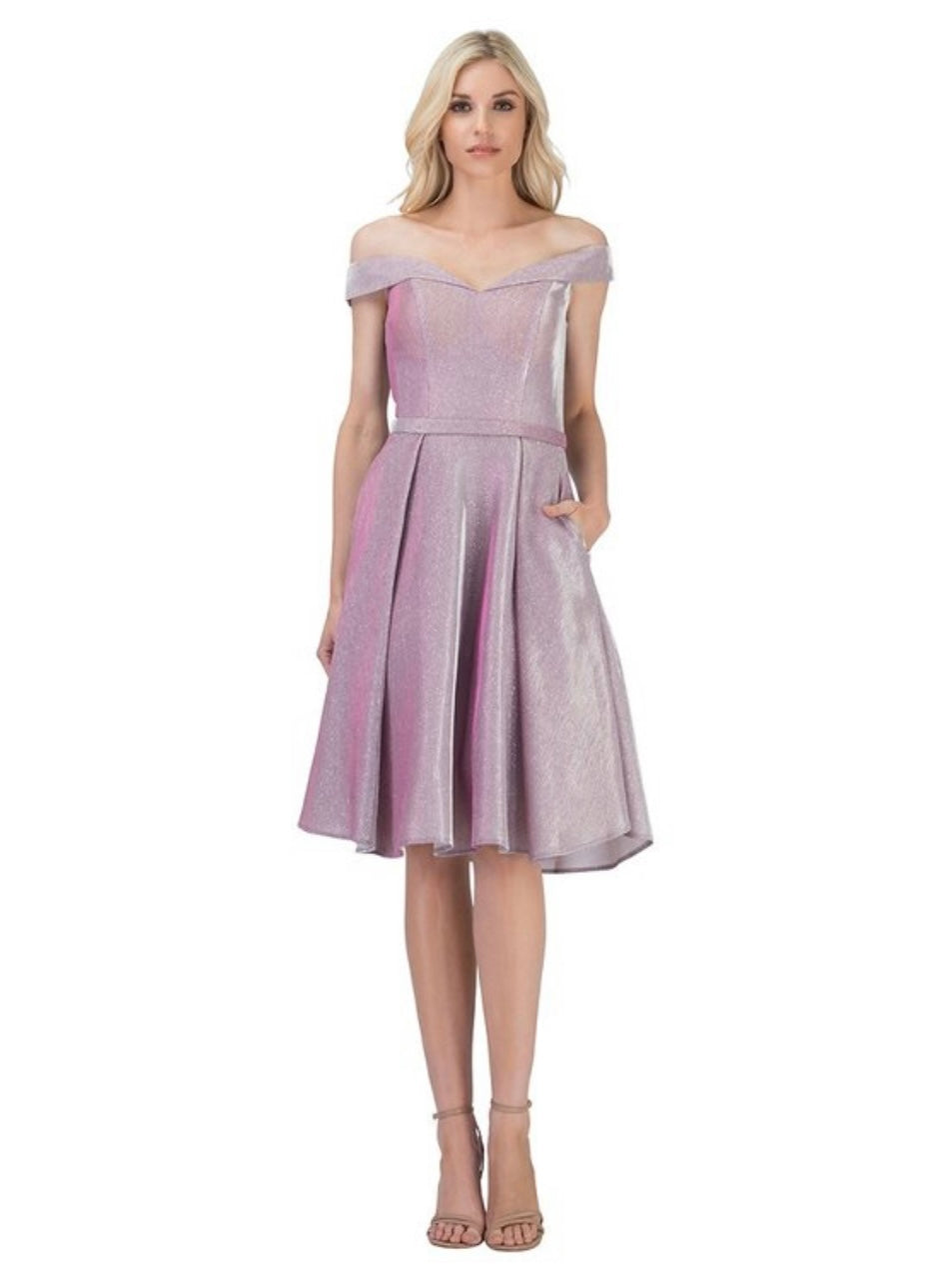 Short cocktail-style dress featuring an off-the-shoulder sweetheart neckline. Made of shimmering iridescent fabric, it showcases an A-line silhouette with soft pleats and a matching waistband that accentuates the figure. Its elegant and modern design makes it perfect for semi-formal events and parties.Available colors: silver, pink, blue, champagne, rose.