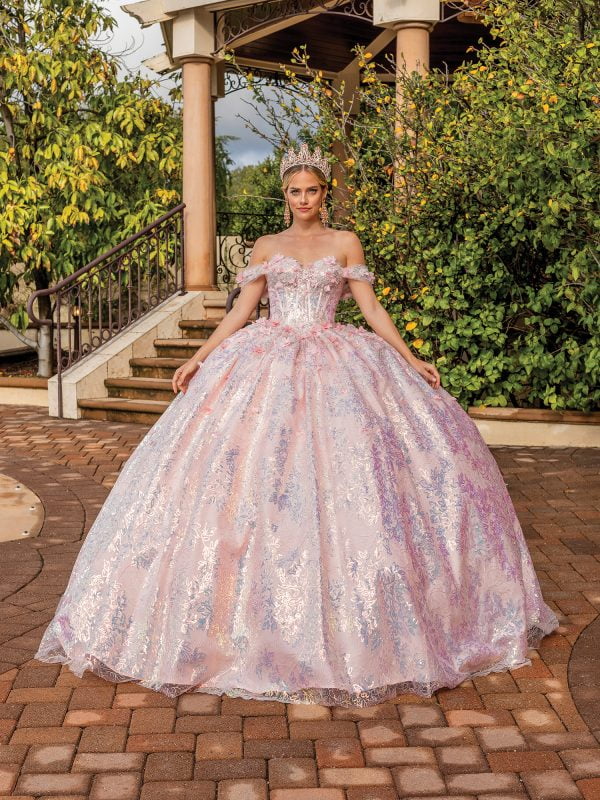 Make your milestone celebration truly unforgettable with the Dancing Queen Quinceañera Dress 1895. This elegant ball gown showcases a fitted bodice adorned with exquisite embroidery and shimmering accents that exude sophistication. The voluminous skirt flows gracefully, creating a dramatic and regal silhouette perfect for your grand entrance. With delicate off-the-shoulder sleeves and a lace-up back for a custom fit, this gown is designed to make you feel like royalty on your special day.
