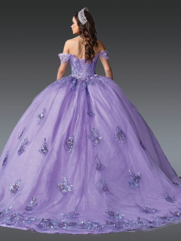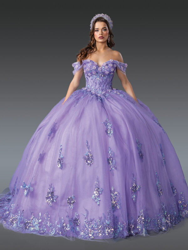 Make your Quinceañera truly unforgettable in the Dancing Queen Quinceañera Dress 1929. This exquisite gown features a romantic sweetheart neckline and an intricately designed bodice adorned with shimmering details and floral appliqués. The voluminous ball gown skirt creates a dramatic silhouette, perfect for a grand entrance. With its elegant off-the-shoulder straps and a lace-up back for a customizable fit, this dress is crafted to make you feel like royalty on your special day.