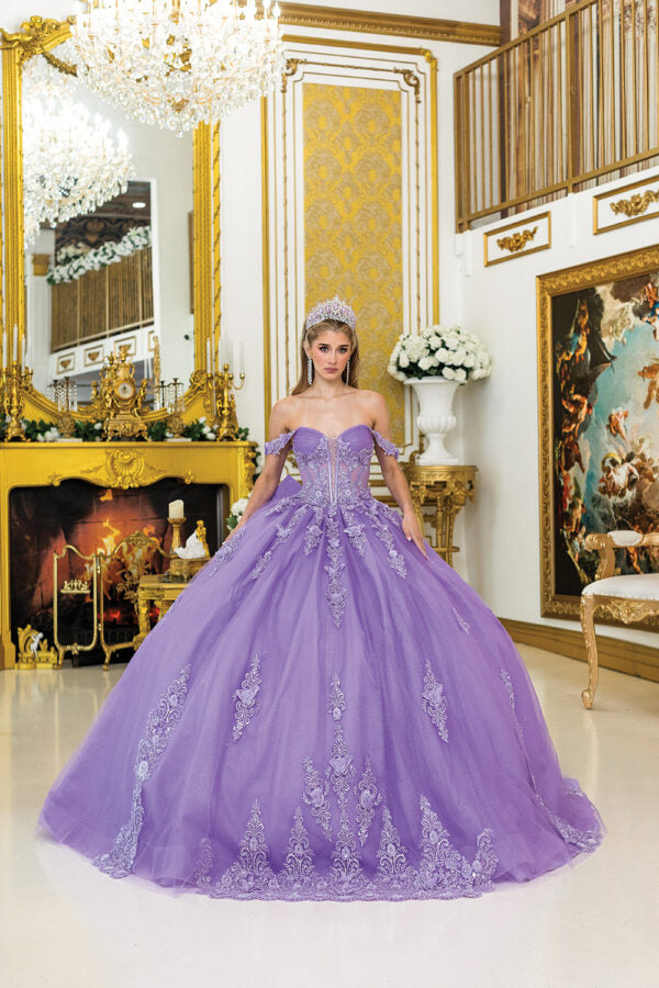 The Dancing Queen Quinceañera Dress 5001 is a stunning and regal gown designed to make you feel like royalty on your special day. Featuring a structured corset bodice with elegant boning details, the dress enhances the figure while offering both support and a dramatic look. Intricate lace appliqués and sparkling embellishments add a luxurious touch, cascading down the voluminous ball gown skirt. Off-the-shoulder sleeves paired with a sweetheart neckline bring a timeless charm, while the full-length silhouette ensures a graceful and unforgettable entrance. Perfect for quinceañeras, sweet sixteen celebrations, or any grand event.
