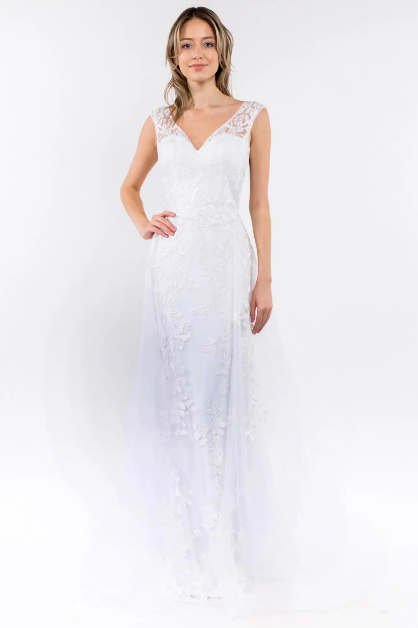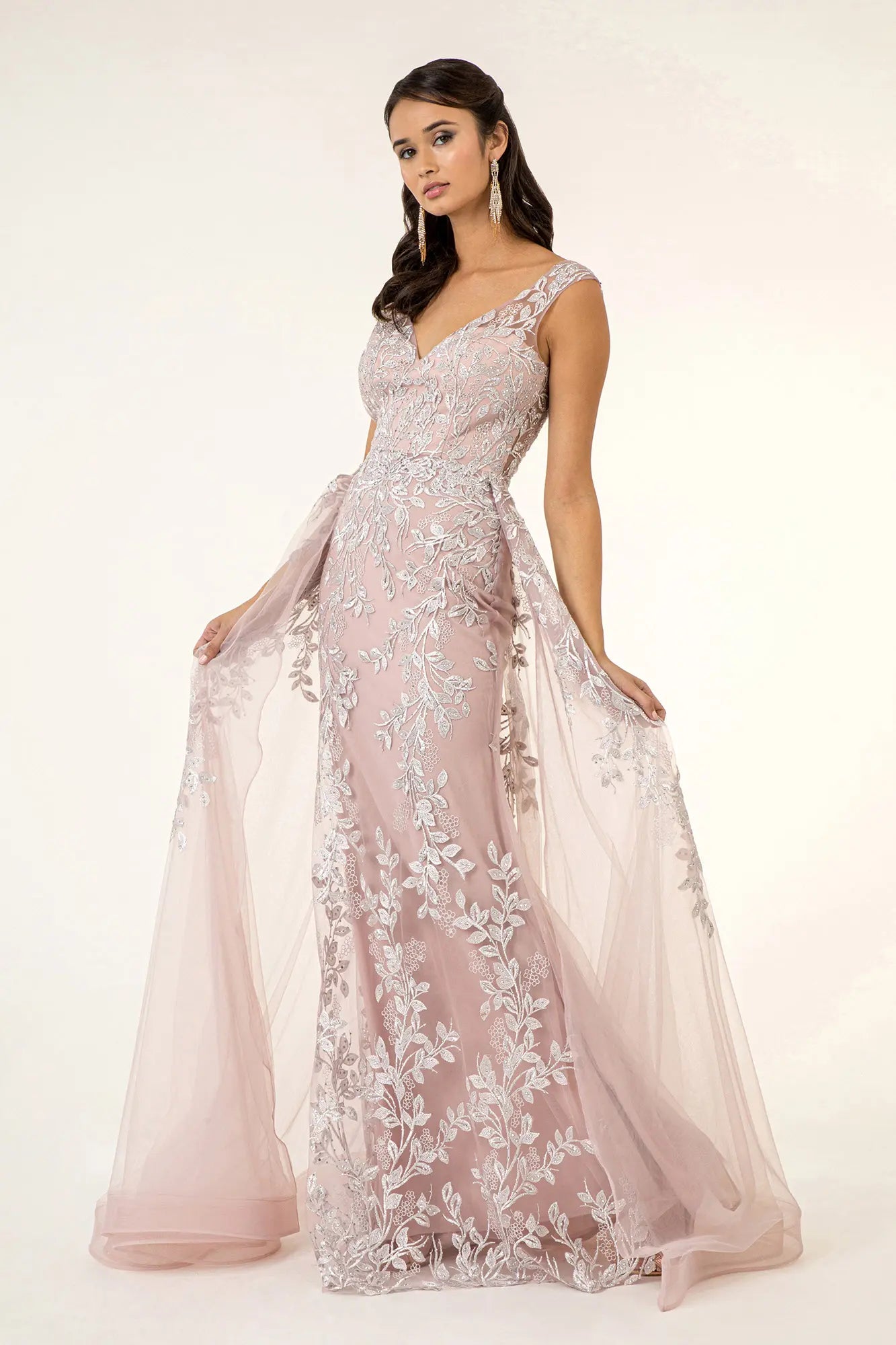 Ethereal and elegant, GL1920 by GLS Collective is a breathtaking A-line gown featuring floral embroidery, sparkling jewel embellishments, and delicate 3D flower appliqués. The illusion V-neckline and sheer back add a soft romantic touch, while the airy mesh overlay flows from the waist to the floor for a graceful finish. Available in Smoky Blue, Dusty Rose, Champagne, and Off White—perfect for prom, quinceañeras, weddings, or any dreamy occasion.