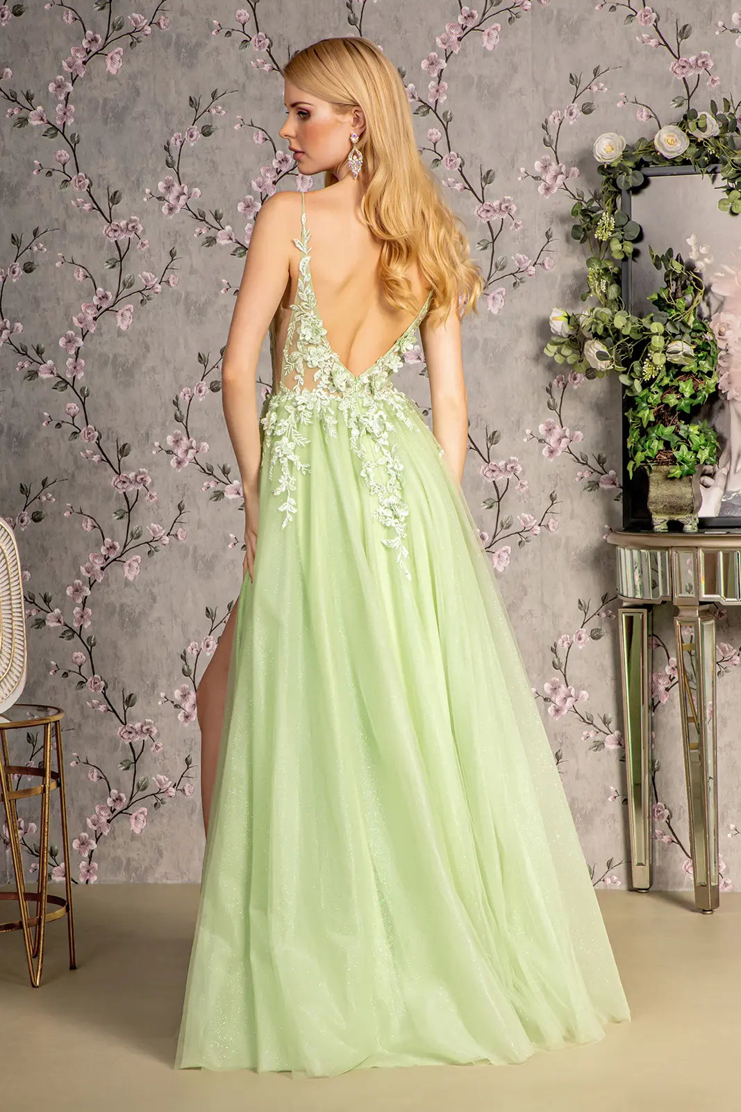 Ethereal and eye-catching, GL3202 by GLS Collective is a light green A-line gown featuring a sheer bodice embellished with glitter and delicate 3D flower appliqués. The flowing mesh skirt includes a subtle side slit, adding a modern, graceful touch—perfect for proms, garden parties, or whimsical formal events.