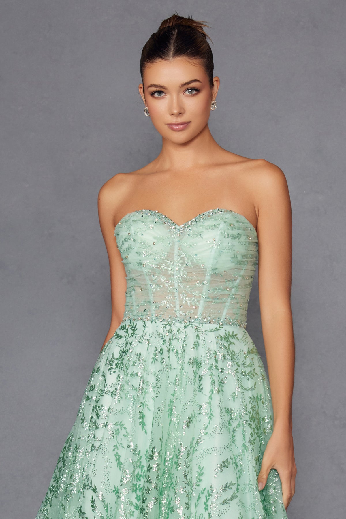 The Juliet Evening Gown JT2547S is a strapless A-line gown designed to make a statement at any formal occasion. It features a sweetheart neckline and a fitted bodice with corset boning that enhances the silhouette. The open back is secured with a zipper closure, adding to the gown’s elegant design. The floor-length A-line skirt flows gracefully with a sweep train, creating a dramatic effect as you move. The gown is adorned with glitter print and beaded embellishments, adding a touch of sparkle and sophistication. Crafted from tulle and polyester, it is fully lined and includes built-in bra cups for added comfort and support.