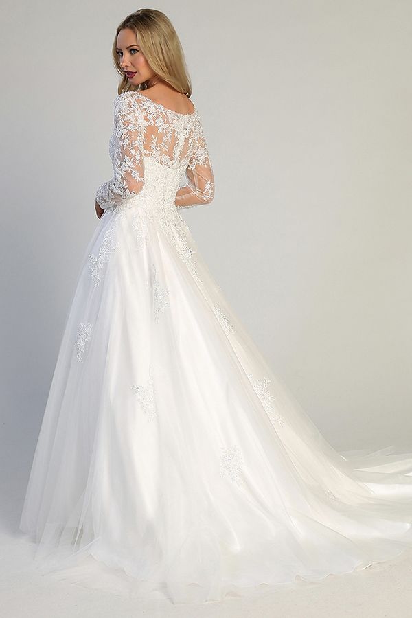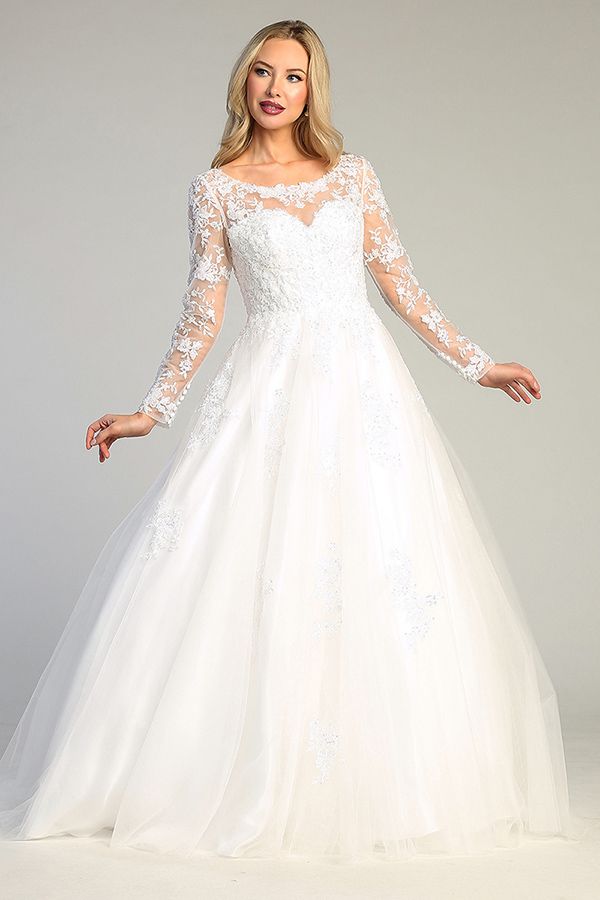 Timeless and refined, this Let’s wedding gown exudes classic bridal elegance. Featuring a romantic illusion neckline with delicate lace appliqués, the fitted bodice flows into a full A-line tulle skirt for a graceful and flattering silhouette. The long sheer sleeves are beautifully embroidered with floral lace, adding a touch of vintage charm. This gown is perfect for brides seeking a sophisticated look with soft, feminine details ideal for both traditional and modern ceremonies.