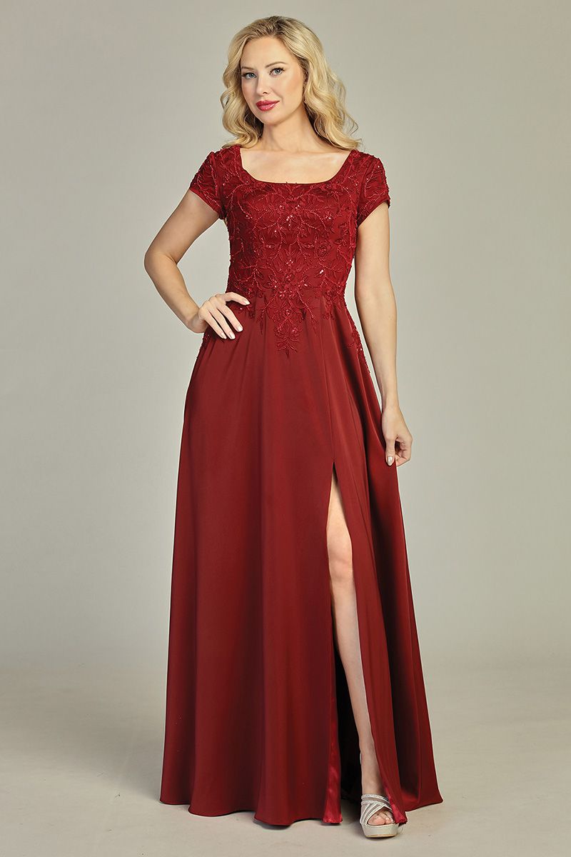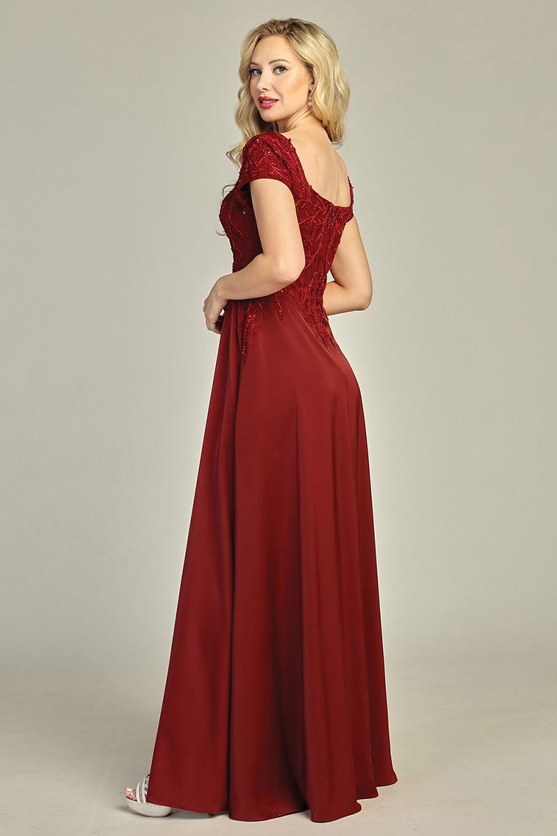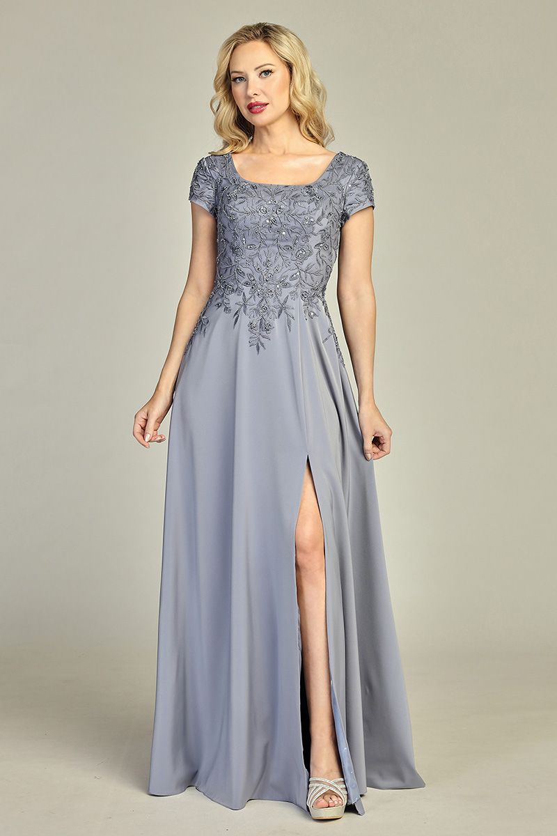 Look elegant and sophisticated in this long dress by Let’s, style 7906. Featuring a square neckline and short sleeves, it combines classic charm with modern flair. The bodice is beautifully detailed with embroidered lace and subtle beadwork for added texture and sparkle. The flowing skirt includes a tasteful front slit, adding a hint of allure while maintaining elegance. Ideal for galas, weddings, or any special occasion.