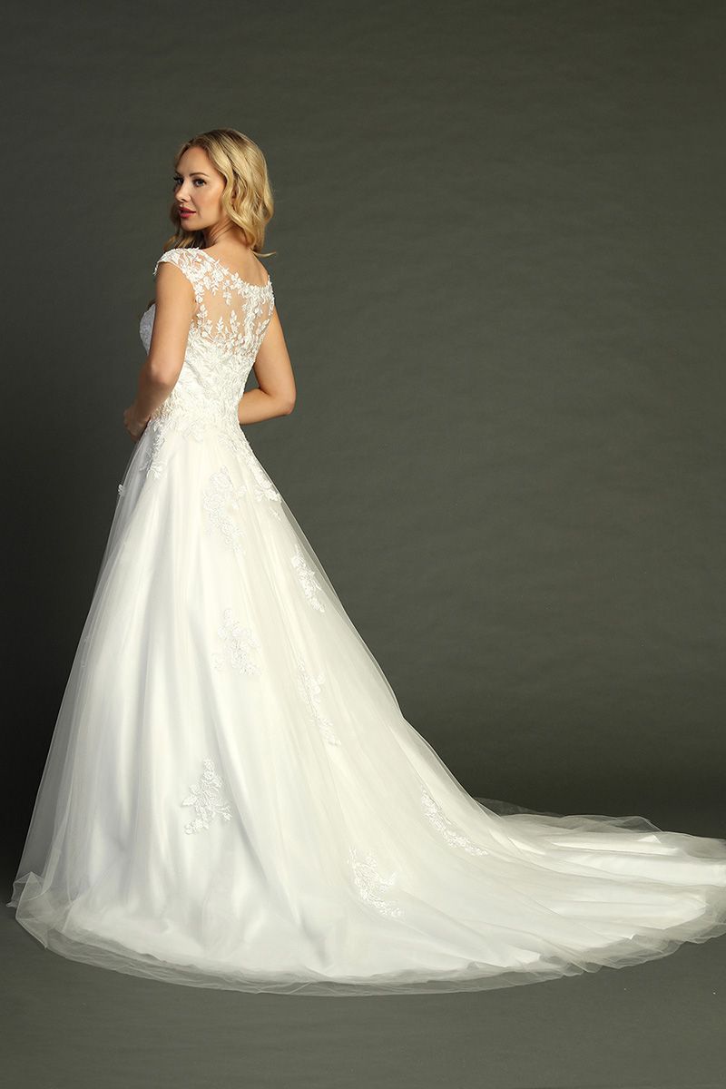Delicate and charming, Let’s bridal gown style 7908 is perfect for the bride seeking a classic look with a romantic touch. The sweetheart neckline with illusion tulle and soft cap sleeves creates a sweet and elegant silhouette. The bodice is adorned with floral lace embroidery that flows gracefully onto the A-line tulle skirt, offering movement and lightness. A timeless design that blends tradition and modern beauty effortlessly.