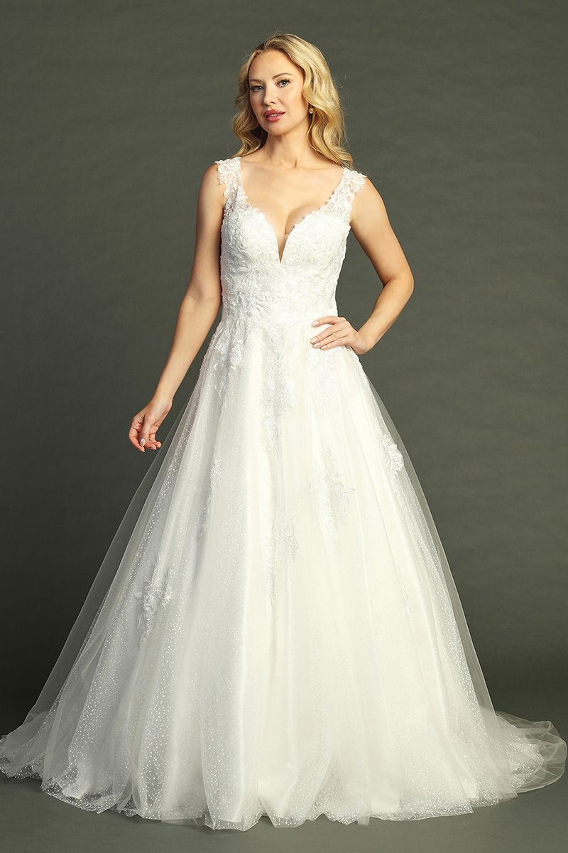 Romantic and feminine, this wedding gown by Let’s features a classic princess silhouette with a deep sweetheart neckline and delicate lace straps. The fitted bodice is adorned with floral appliqués that beautifully enhance the figure, while the voluminous tulle skirt shimmers subtly, adding a magical, ethereal touch. Perfect for brides dreaming of a fairytale wedding, this design blends timeless elegance with modern details.
