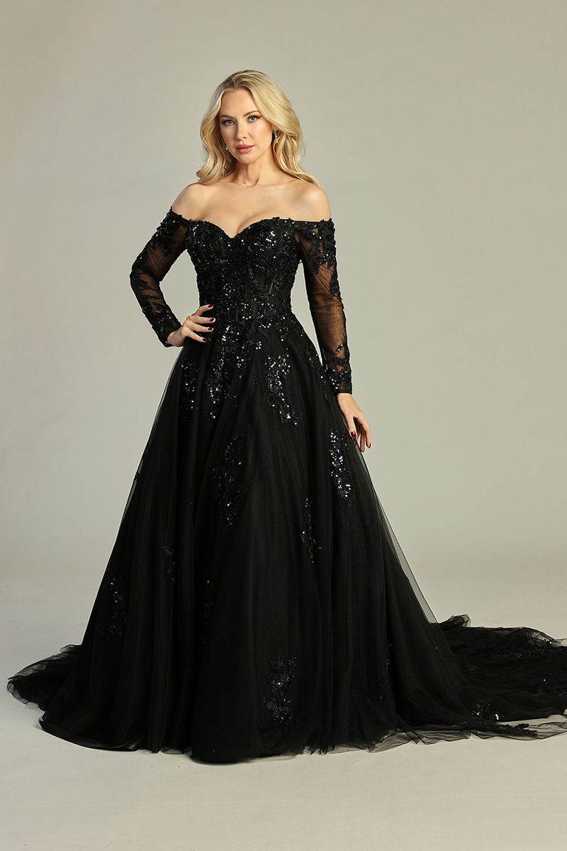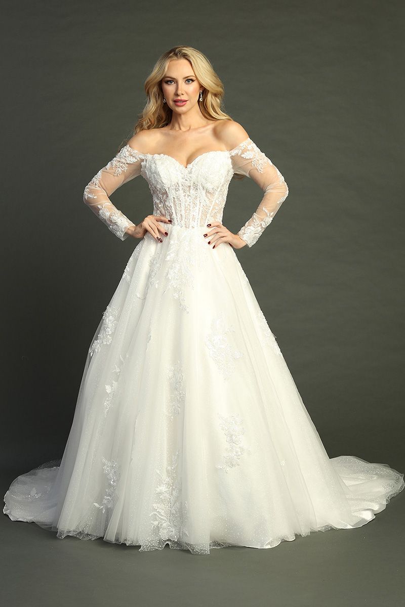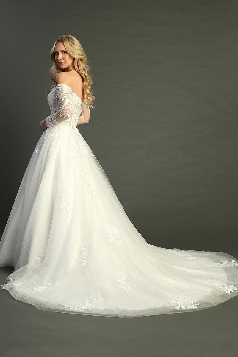 Romantic and sophisticated, Let’s bridal gown style 7989 is a dream come true. Featuring a sweetheart neckline and off-the-shoulder sheer long sleeves, this dress exudes elegance and delicacy. The semi-sheer corset with exposed boning and floral lace enhances the feminine silhouette, while the voluminous tulle skirt with embroidered appliqués adds fairytale-like movement. Perfect for a bride who wants to shine with grace and glamour on her special day.