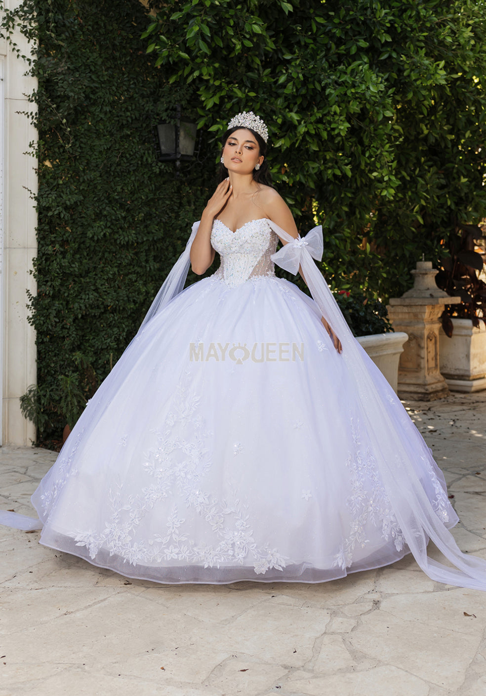 The MayQueen LK263 is a captivating ballgown designed to make a grand statement at any special occasion. This dress features a sweetheart neckline complemented by off-shoulder cape sleeves, adding a touch of elegance and sophistication. The sheer bodice is adorned with intricate floral embroidery and shimmering beadwork, creating a delicate and feminine look. A Basque waistline cinches the figure, leading into a voluminous layered ruffle skirt that adds drama and movement. The gown also includes detachable puff sleeves, offering versatility in styling. A corset lace-up back ensures a secure and customizable fit, while the sweeping train adds a regal finish to the ensemble. Ideal for quinceañeras, weddings, or other formal events, the MayQueen LK263 combines timeless beauty with modern design elements to create a memorable look.