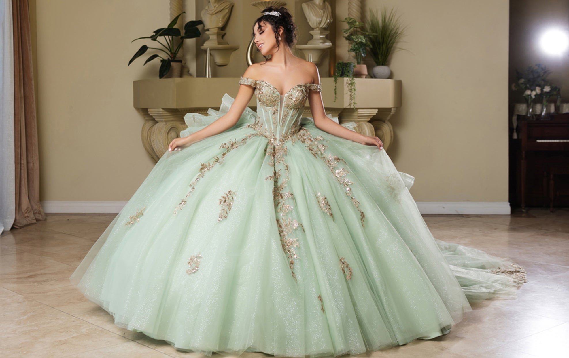 The MayQueen LK272 is a stunning ballgown designed to make a statement at any special occasion. This dress features a sheer corset bodice adorned with intricate lace appliqués and shimmering sequins, creating a captivating and elegant look. The off-shoulder neckline adds a touch of romance, while the structured design ensures a flattering fit. The back of the gown is equally impressive, showcasing a lace-up closure that allows for an adjustable and secure fit. Cascading ruffled layers add volume and drama, leading into a voluminous ballgown skirt that gracefully flows into a sweeping chapel train. An oversized bow at the back enhances the gown’s regal appearance, making it perfect for quinceañeras and other grand celebrations. Crafted for those who desire a blend of traditional elegance and contemporary flair, the MayQueen LK272 is sure to leave a lasting impression.
