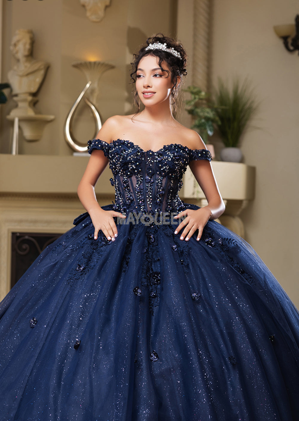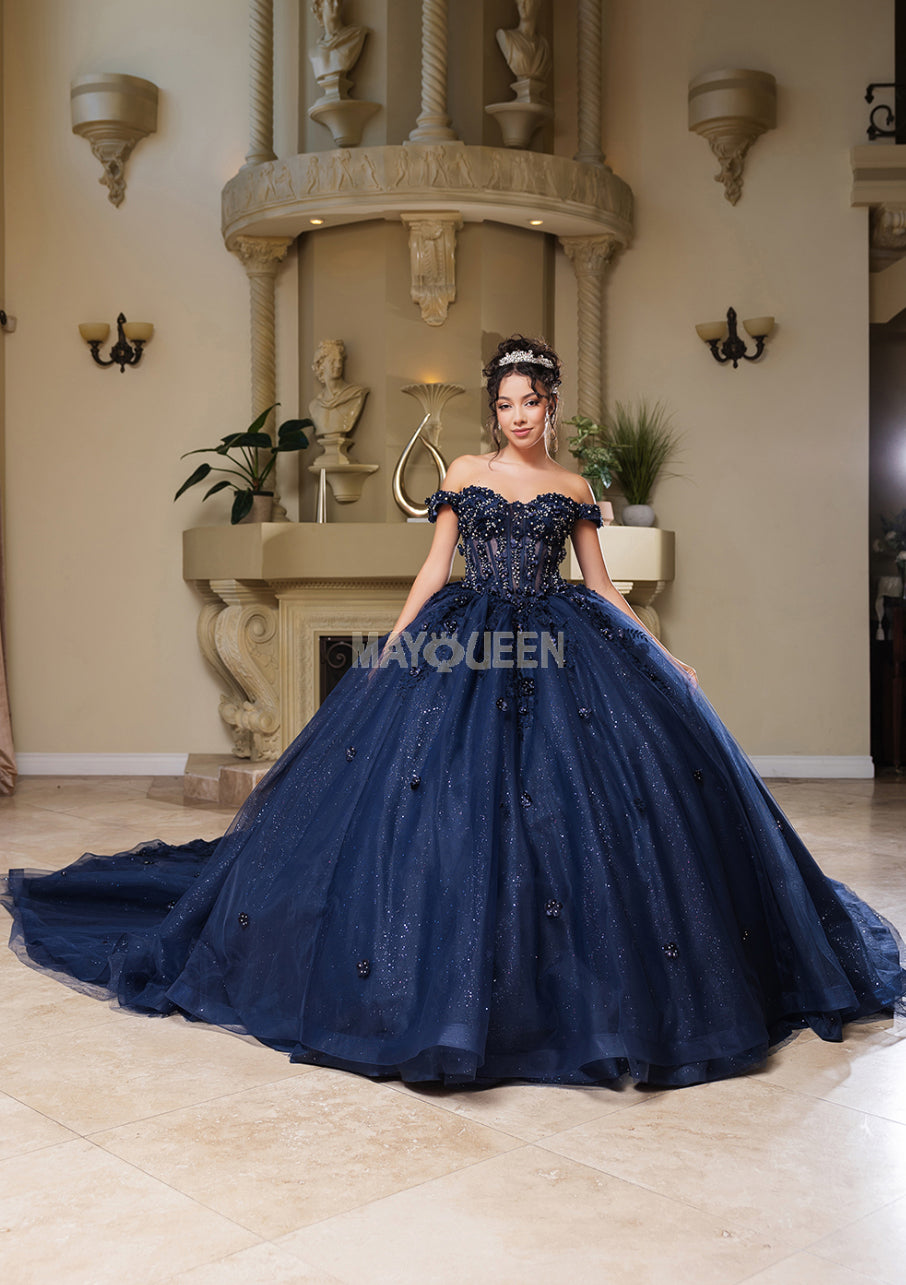 The MayQueen LK278 is an exquisite quinceañera ball gown designed to bring fairy tale elegance to life. It features an off-the-shoulder sweetheart neckline that gracefully frames the décolletage and shoulders. The bodice showcases a sheer, corset-inspired structure, enhanced with three-dimensional floral appliqués, exquisite sequin embellishments, and soft-cup padding for both comfort and a flawlessly sculpted fit .Transitioning into a majestic full skirt, the design is crafted from glitter-emblazoned tulle that glistens with every movement. The skirt concludes in a long sweep-brush train with a horsehair hemline for structured volume and refined flow . A lace-up back ensures a customizable and elegant fit suited to your silhouette .This gown is perfect for quinceañeras, sweet sixteen celebrations, or any grand event where you want to make a stunning, memorable entrance.